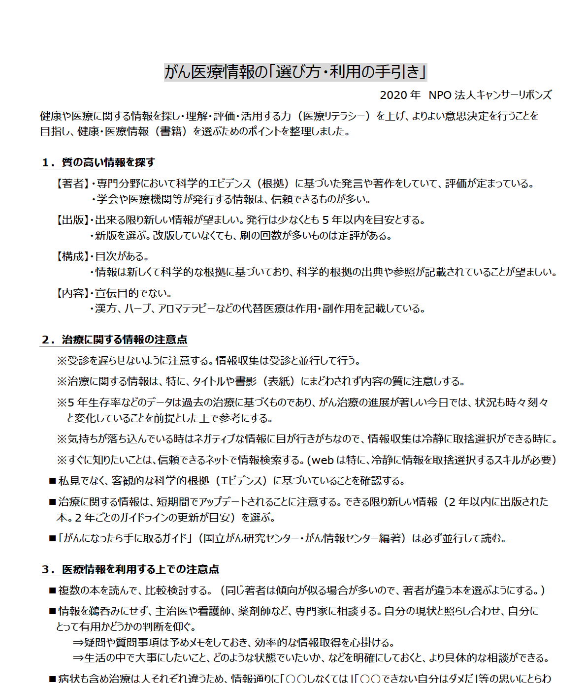 そこで、薬剤師や看護師といったメンバーで、がん医療情報の「選び方・理由の手引き」を作成いたしました。
